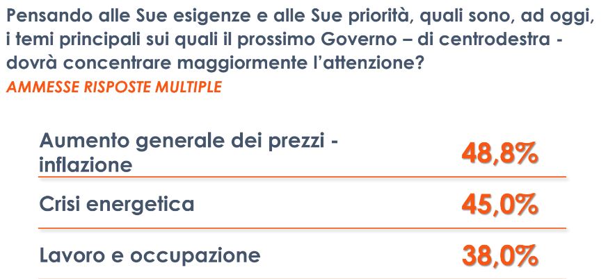 ROMA (ITALPRESS) – L’ultima nota mensile dell’ISTAT relativa all’andamento economico del nostro Paese ha confermato un’ulteriore accelerazione dell’inflazione nel corso del mese di settembre e, secondo l’OCSE, il perdurare della crisi energetica potrebbe causare una decelerazione dell’economia mondiale. Temi che la popolazione italiana percepisce e vive quotidianamente e che, ad oggi, rappresentano una priorità per la maggioranza degli italiani. Al prossimo governo, quindi, si chiede di intervenire tempestivamente sull’aumento generale dei prezzi (48,8%), sulla crisi energetica e l’aumento dei prezzi delle utenze (45%), senza trascurare il lavoro e l’occupazione, ancor di più nelle aree meridionali (38%).